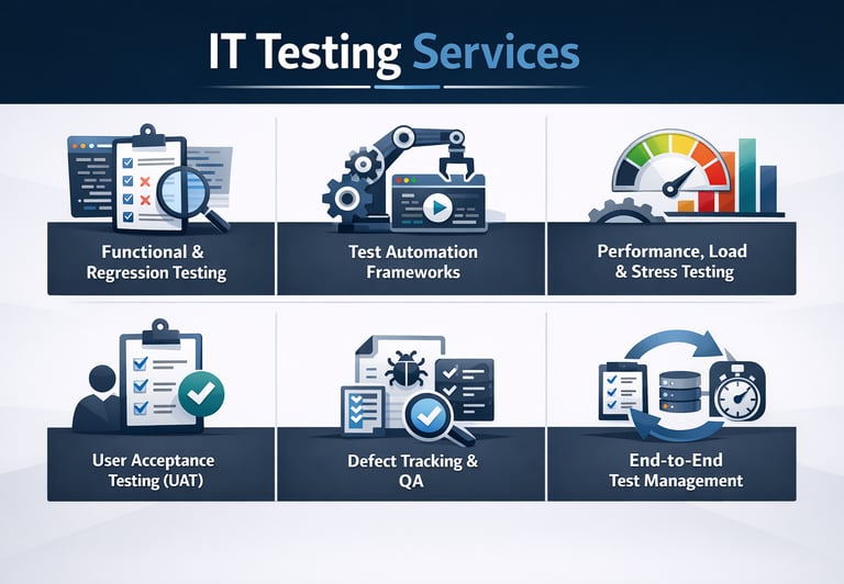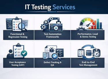 Quality and reliability are at the core of every successful digital solution. Our IT Testing Services ensure your systems, applications, and integrations work flawlessly before they reach your users. We combine industry‑standard methodologies with hands‑on expertise to identify issues early, reduce risk, and improve overall performance.